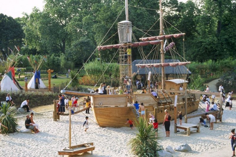 On this beautiful playground children can run, play, jump around and rage to their heart’s content. Many climbing frames invite the kids to have a lot of fun and explore the world. The huge pirate’s ship might be the highlight. While their little ones are busy, parents can make themselves comfortable on the green areas around the playground.