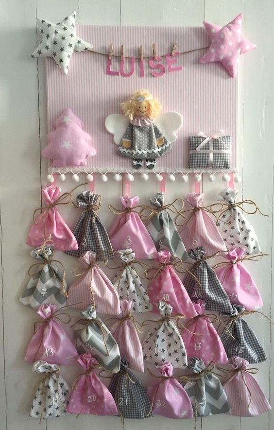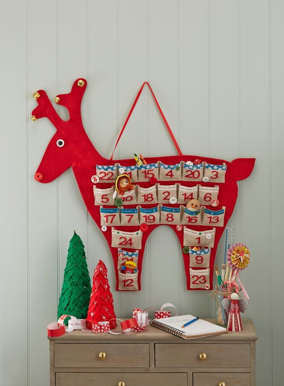 This beautiful reindeer kids’ Advent calendar is made out of felt fabric. Sew little pockets onto the reindeer and fill them with sweets or small presents for your kids. On the antlers you can attach little bells. This Advent calendar is also a nice Christmas decoration for the kids’ room.
