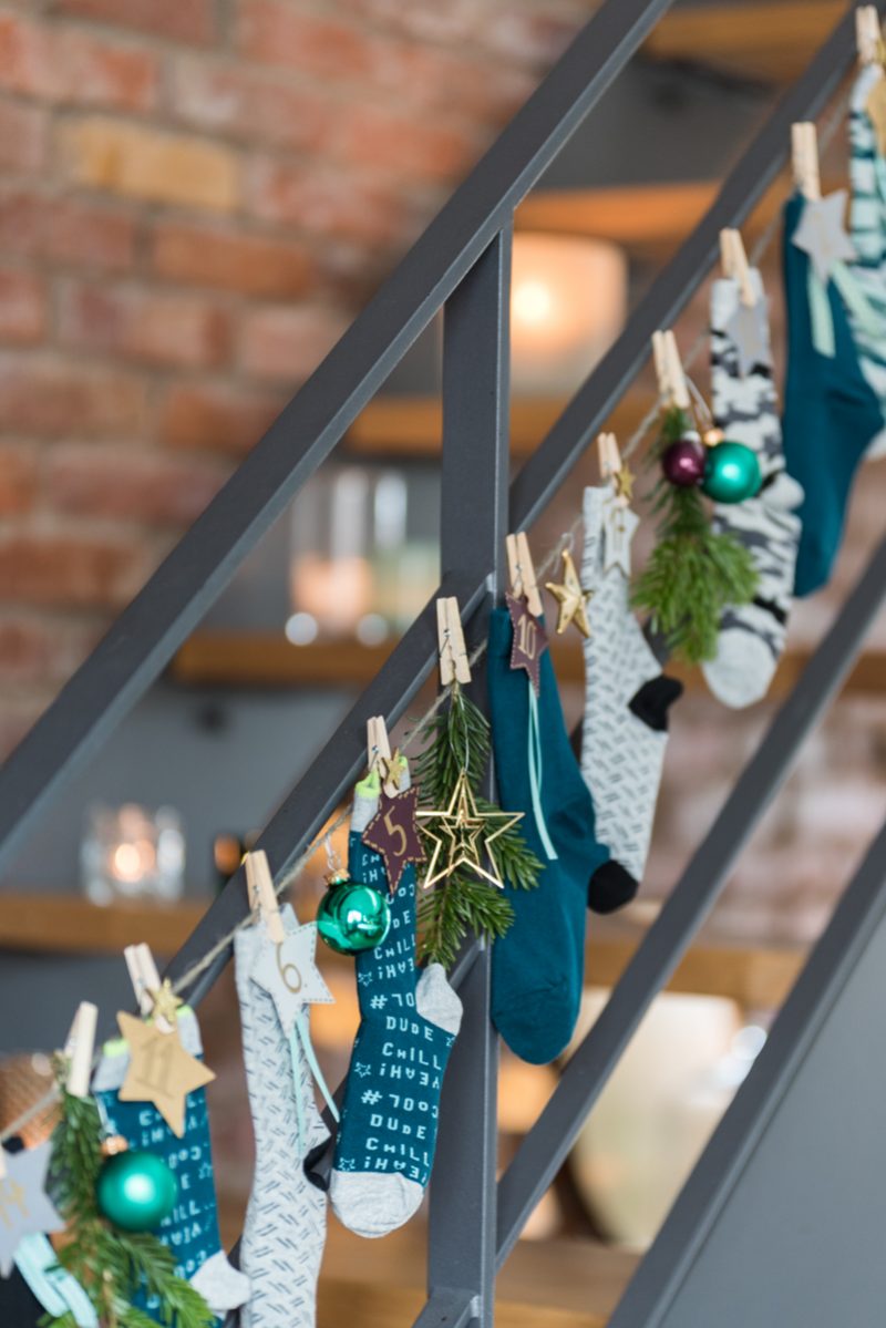 For this classic DIY advent calendar for kids you will need Christmas socks, a ribbonChristmas wood clips and some nice Christmas decoration. Number the socks and fill them with little sweets, toys, notes, coupons or anything you want.