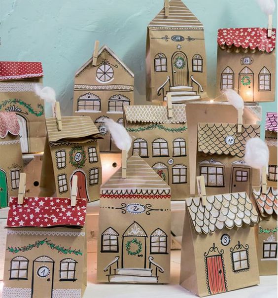 For this kids’ Advent calendar idea you will need cardboard, transparent craft paper, some Christmas decoration and fairy lights. Out of the cardboard, tinker the little cottages. Create the windows with the transparent paper so that the fairy lights will shine through. Fill the cottages with little gifts like sweets or toys. Looks amazing in every kids’ room!