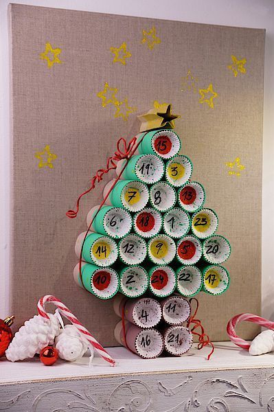 For this kids’ Advent calendar idea you can use for example empty Pringles rolls. Paint them with different colors and fill them with small gifts for your kids. At the open end you can place a muffin paper on which you write the numbers. Fix the rolls in the shape of a Christmas tree and your DIY Advent calendar is made!