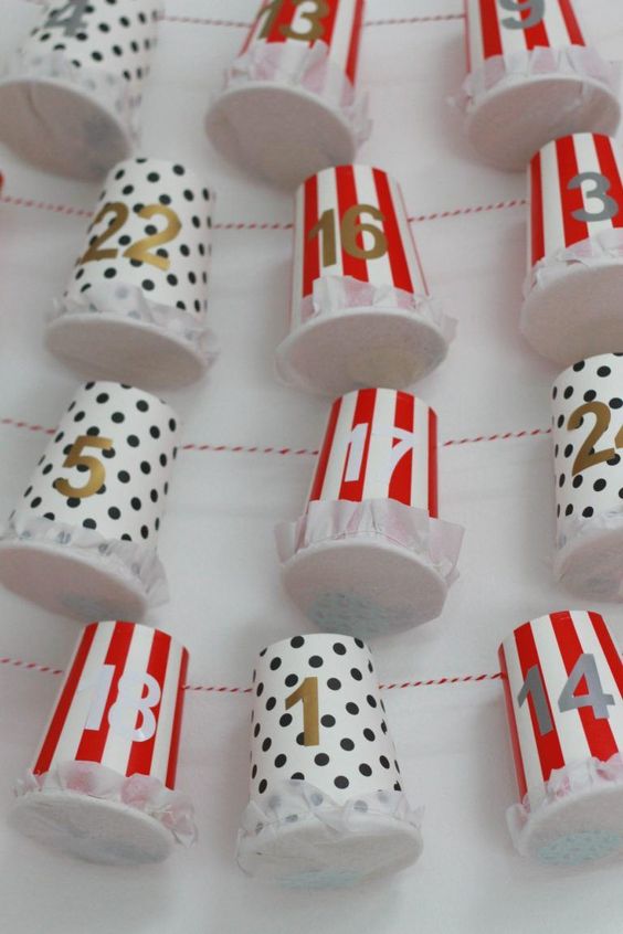 For this DIY Advent calendar idea you will need paper cups. Punch two opposite holes in each cup so you can thread a string through it. Fill the cups with little gifts your kids will love and close them with paper and an elastic band. Hang up the cups and don’t forget to number them.