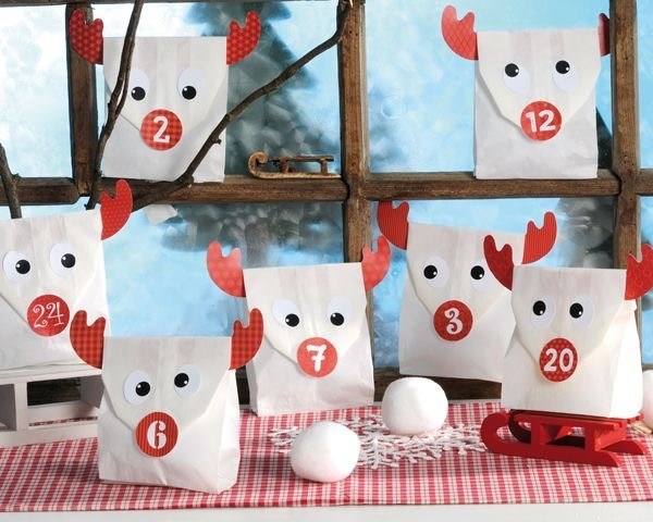 This cute elk Advent calendar for kids is very easy to make. All you will need is sandwich paperhandicraft paper and numbered stickers. Cut the sandwich paper to the point so that a snout is formed. Create the elks’ antlers and eyes and glue them and the numbers on the sandwich paper packages. Done!