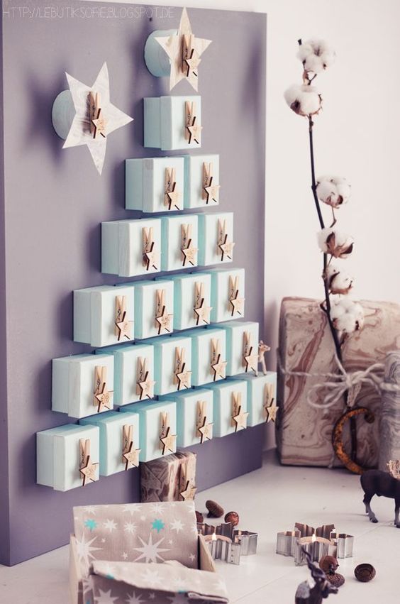 For this kids’ Advent calendar you will need 24 paper gift boxes. Fill them with lovely items for your children and place them on the wall in the shape of a christmas tree. Number the boxes for example with big star clothes pegs. Made it!