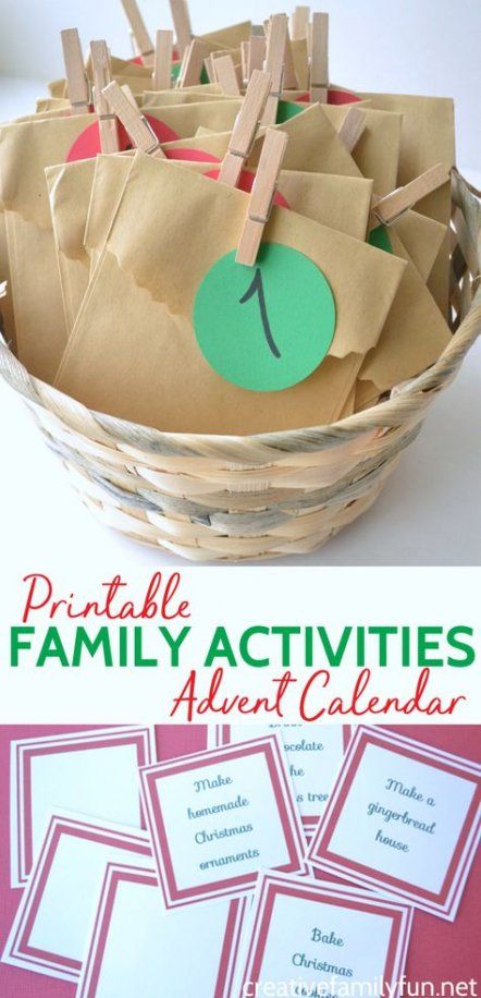 Creating this simple kids’ Advent calendar is very easy. Just print out little family activity cards (or similar things) and put them in paper sachets. Number the sachets with colorful cardboard and clothes pegs and place everything in a small basket. Your kids will surely enjoy the family activities.