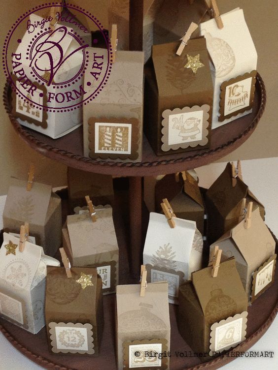 This simple Advent calendar for kids is made out of paper boxes. Decorate the boxes with christmas pictures, Christmas stickers and clothes pegs. You can fill the boxes with little things your kids will love and place them on a cupcake stand.