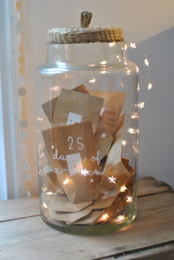 This is a kids’ Advent calendar for gifts like family activities, coupons or anything similar. Fill small paper sachets with activity cards. Number them and put them into a glass vessel. Decorate the Advent calendar with fairy lights and it will be an eye catcher for the kids’ room.