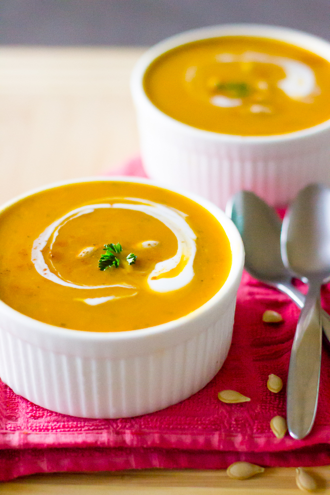 add soup to bowls and add a bit of coconut milk, fresh parsley and pumpkin seeds
