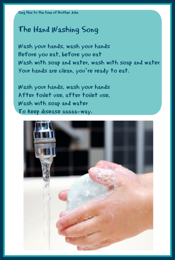 8. Teach your kids a hand washing song they can sing that lets them know how long they should keep washing. Print out this copy and post it next to the sink if they need help remembering.