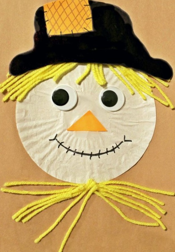 This funny scarecrow is made out of a cupcake liner, yarn, construction paper and googly eyes. In addition to that you will need scissors, a glue and a marker. This nice atumn craft for kids is finished in only a few minutes.