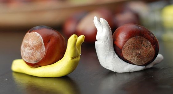 For this cute autumn craft you will need play dough, chestnuts and a thin wooden stick. What about home made play dough? It is so easy and fun to do with kids! Shape the play dough and fix a chestnut on it. With the wooden stick, draw cute faces for the snails. For more autumn crafts with chestnuts have a look our nutty creations.