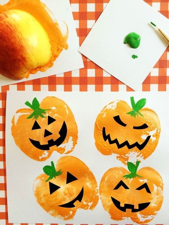 These pumpkins are stamped with an apple. Just cut an apple in two halfs and color the cutting surface. Press it on a piece of paper and the pumpkin shape is made. Then, draw some funny or spooky faces onto it and your pumpkins are completed.
