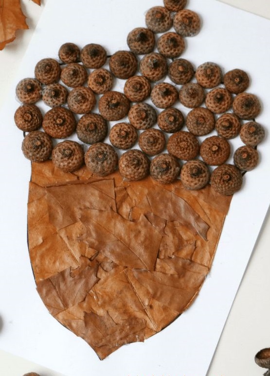A nice autumn craft for kids, made out of natural materials. Collect some acorns and leaves with your children und remove the acorns’ little “hats”. Draw the shape of an acorn and fill it out with the acorn hats and leaves. Looks really amazing!