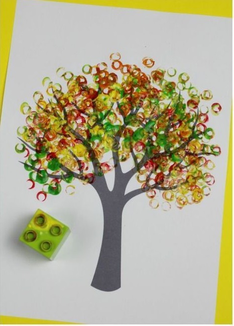 This autumn craft is easy to create, especially for young children. Just draw the branches of a tree. Then dip a Lego brick in the colors and press it on the paper. If you do it a lot of times, a beautiful autumn tree will arise.