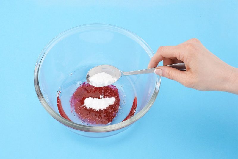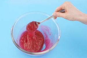 Put the glue in a bowl. Stir in the food coloring and the baking powder.