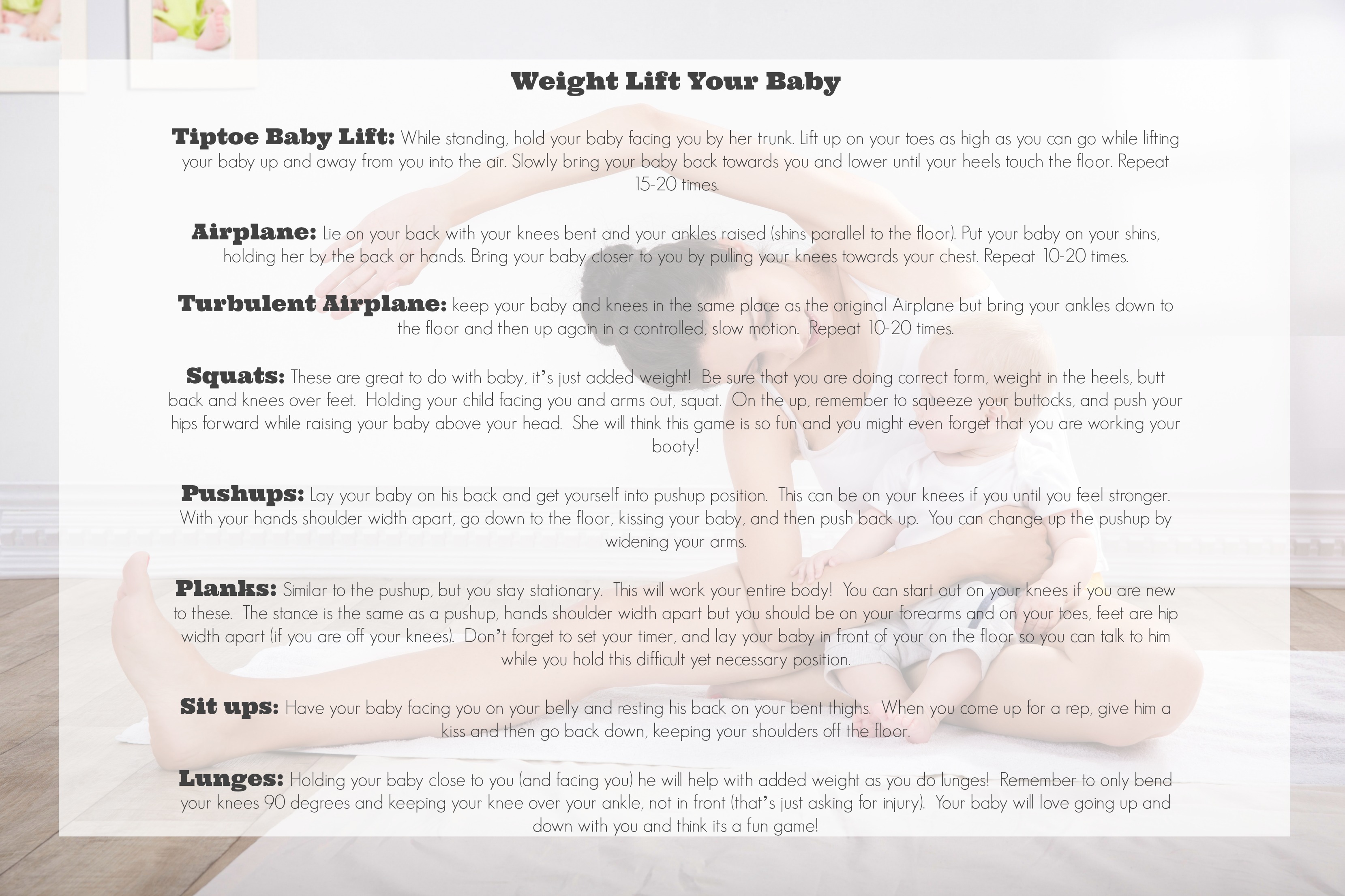 If you don’t find the time to go out and participate in a class don’t despair! Here are a few weight lifting moves you can try with your baby at home.