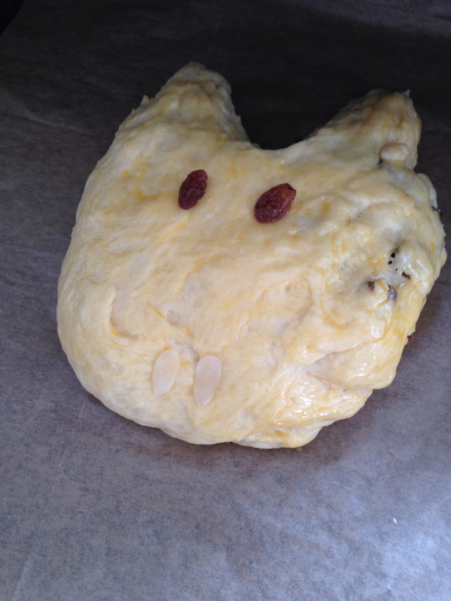 For the big bunny head we added raisins to the dough and cut into a piece of dough. The ears of the bunny you can form them until you are happy with it. Add raisins as eyes and almonds as teeth.