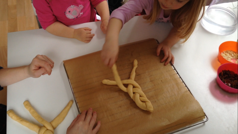 Let it rest again for 45 minutes. Then knead it again with your hands and form strings of dough. We made small ones but you could also use the whole dough on one single braid.
