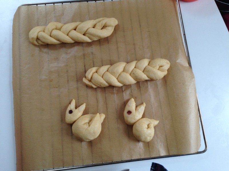 The little bunnies are made from one string of dough for the body and the ears are simply cut in. Add almonds and raisins as ears and eyes.